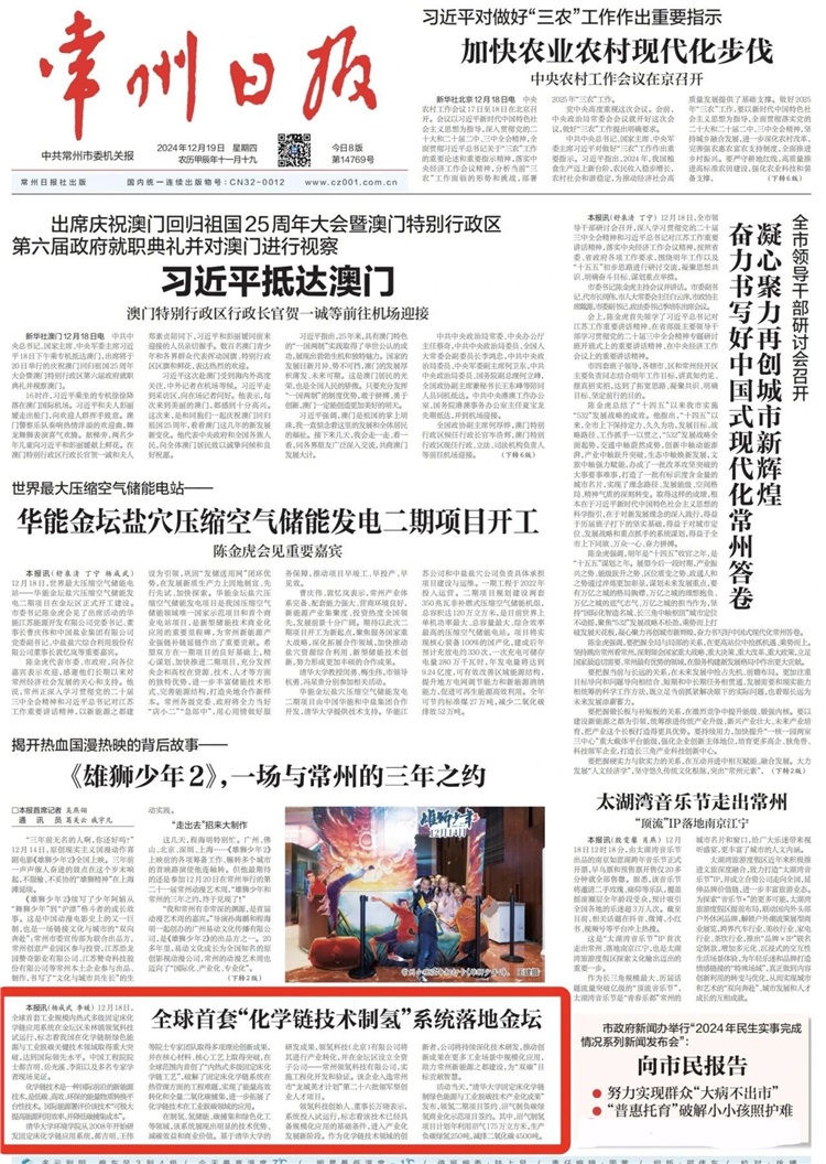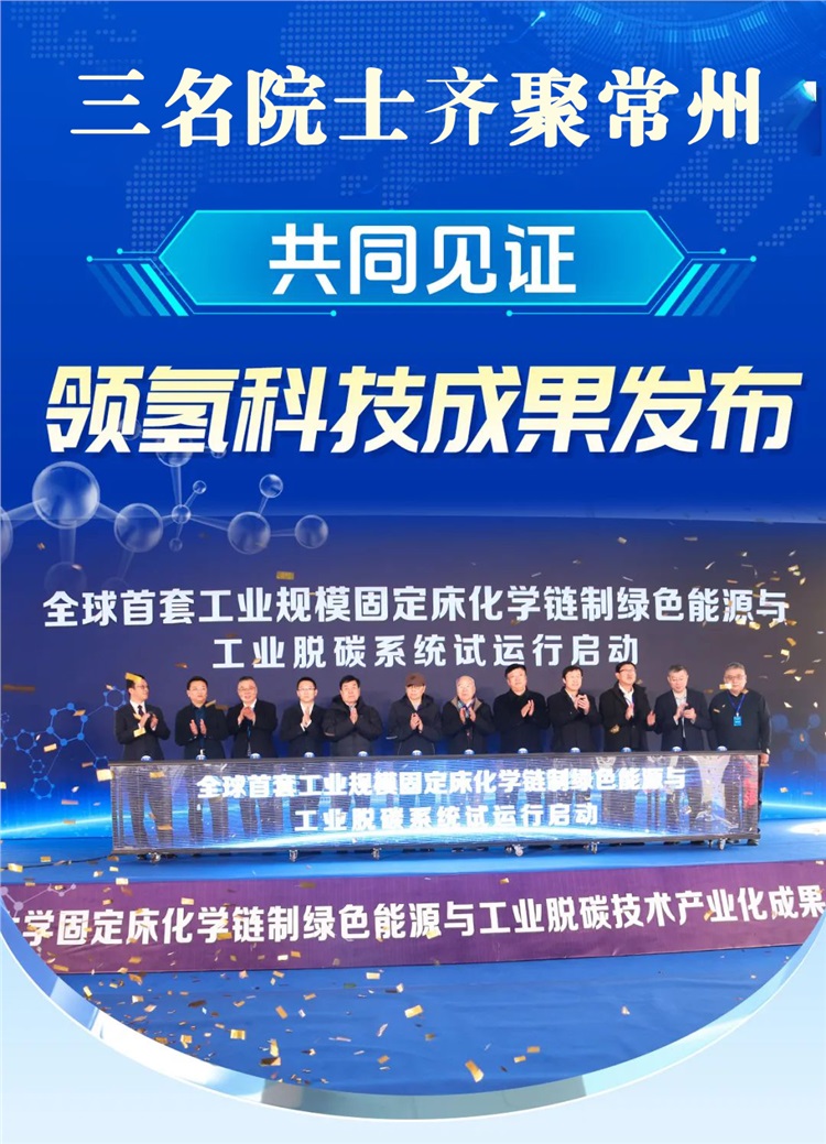 2024年12月18日,全球首套工業(yè)規(guī)模內(nèi)熱式多級(jí)固定床化學(xué)鏈應(yīng)用系統(tǒng)在常州領(lǐng)氫科技試運(yùn)行,這標(biāo)志著我國(guó)在化學(xué)鏈制綠色能源與工業(yè)脫碳關(guān)鍵技術(shù)領(lǐng)域取得重大突破,達(dá)到國(guó)際領(lǐng)先水平。中國(guó)工程院院士郝吉明、岳光溪、李陽(yáng)以及多名教授專家學(xué)者及知名企業(yè)家現(xiàn)場(chǎng)見(jiàn)證。《常州日?qǐng)?bào)》更是在頭版刊發(fā)要聞《全球首套“化學(xué)鏈制氫”系統(tǒng)落地金壇》,報(bào)道領(lǐng)氫科技全球首套“工業(yè)規(guī)模內(nèi)熱式多級(jí)固定床化學(xué)鏈應(yīng)用系統(tǒng)”啟動(dòng)試運(yùn)行。